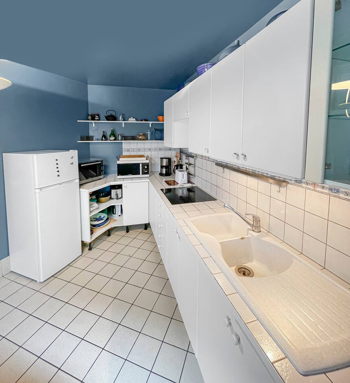 Cuisine : moderne, entièrement équipée avec cafetière filtre, bouilloire, réfrigérateur, grille-pain, plaques, micro-ondes, lave-vaisselle, lave-linge et friteuse.