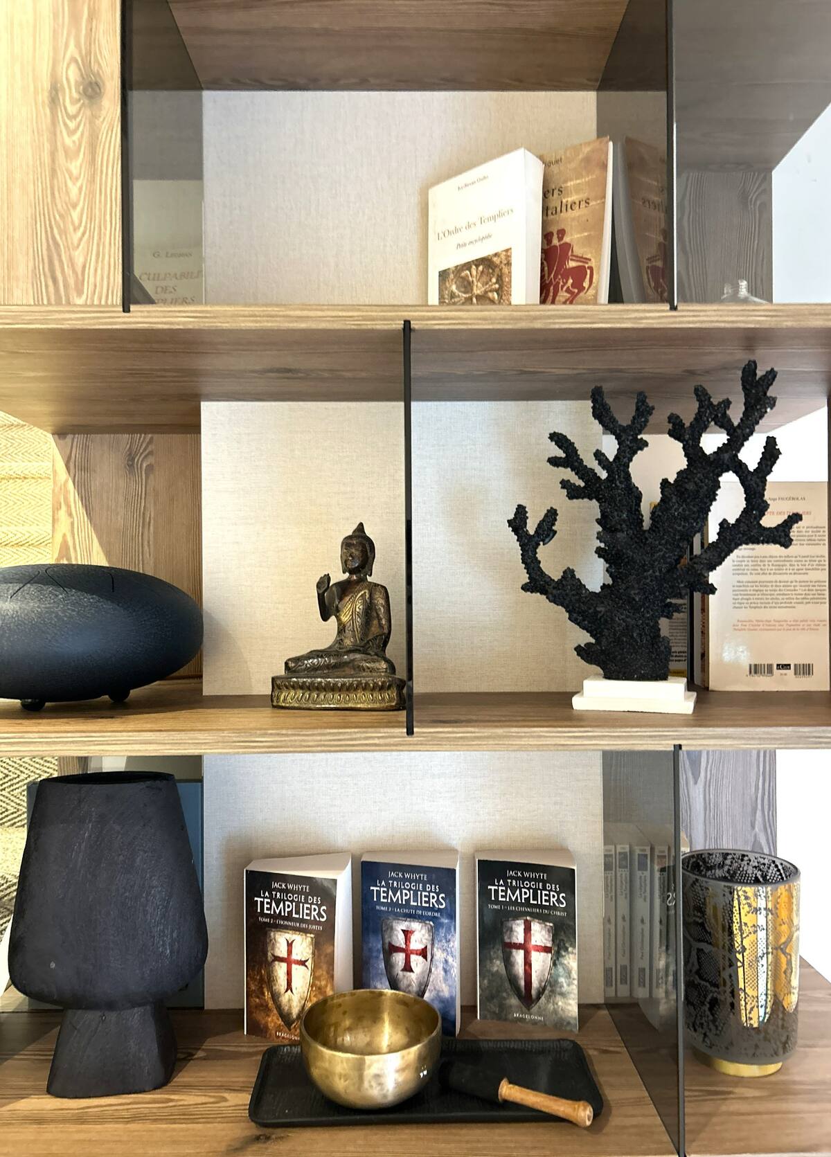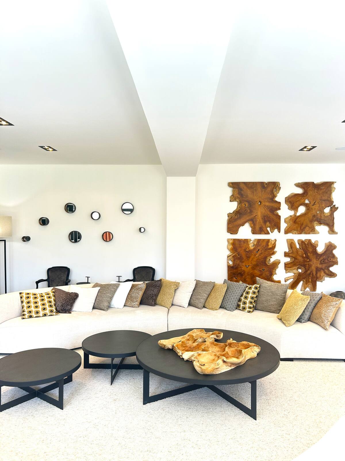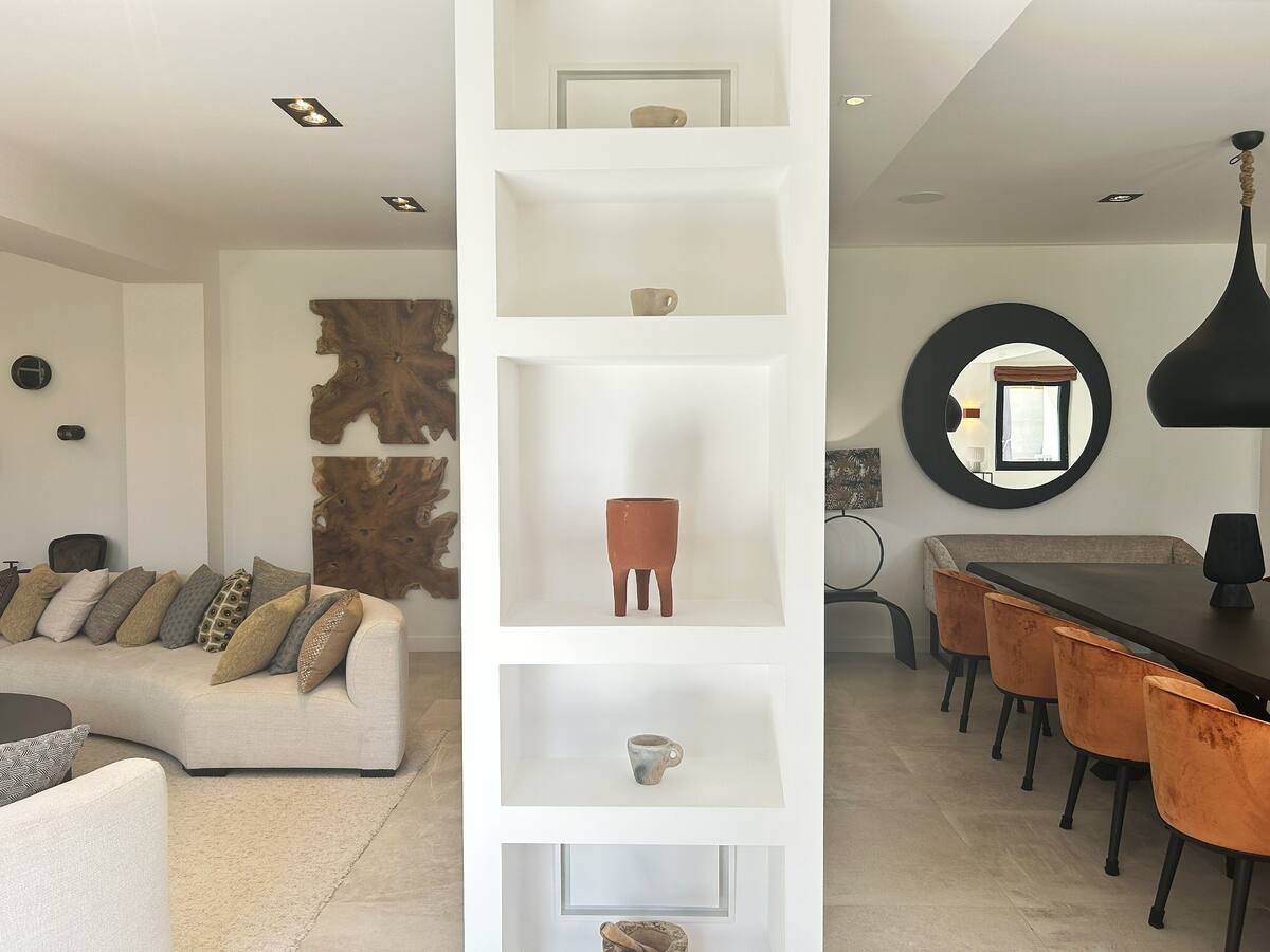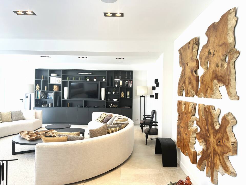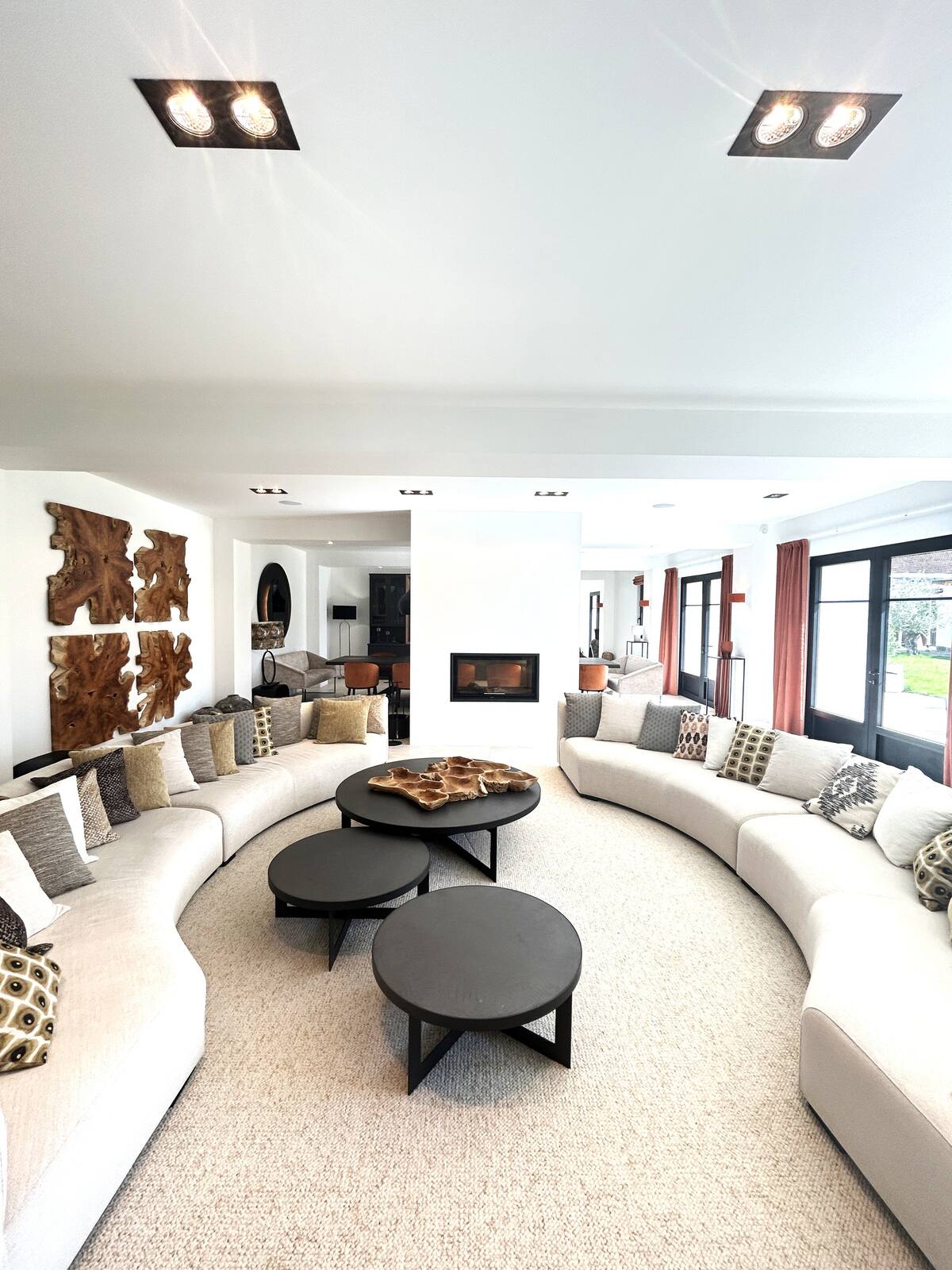 Le salon, spacieux et baigné de lumière naturelle, devient un point de ralliement où l’on aime s’attarder, lire, discuter ou simplement savourer le calme.