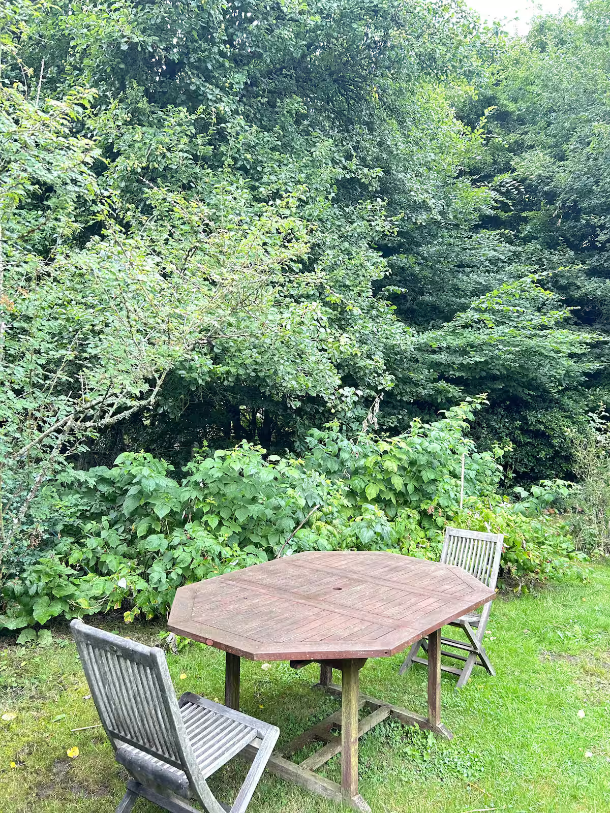 À l’extérieur, une table et des chaises vous attendent pour profiter pleinement de l’air pur et du cadre verdoyant. Idéal pour savourer un petit-déjeuner au soleil ou un moment de détente entouré par la verdure et le chant des oiseaux.